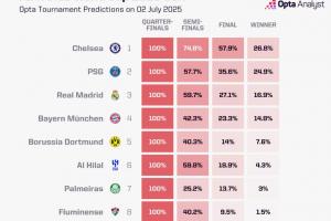 体育资讯07月02日讯 世俱杯8强结果出炉,opta更新了各家豪门晋级和夺冠概率。身处上半区的切尔西夺冠概率登顶,其他4家欧洲球队分列2-5名。
