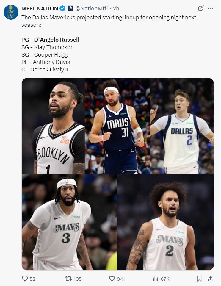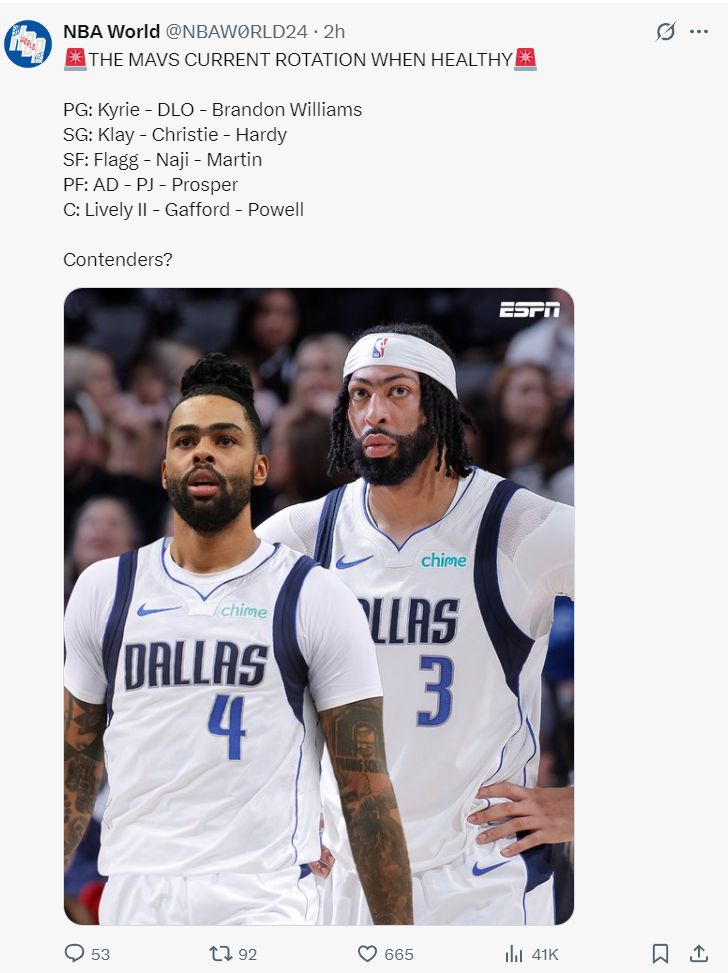 美媒NBA Wrld晒出独行侠目前的阵容后写道:总冠军竞争者?